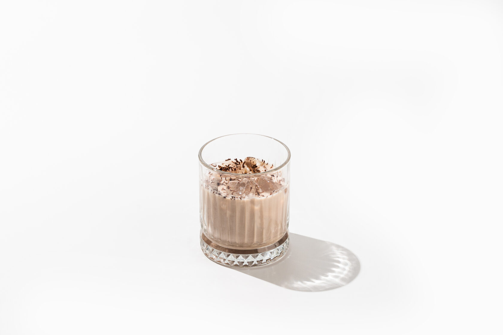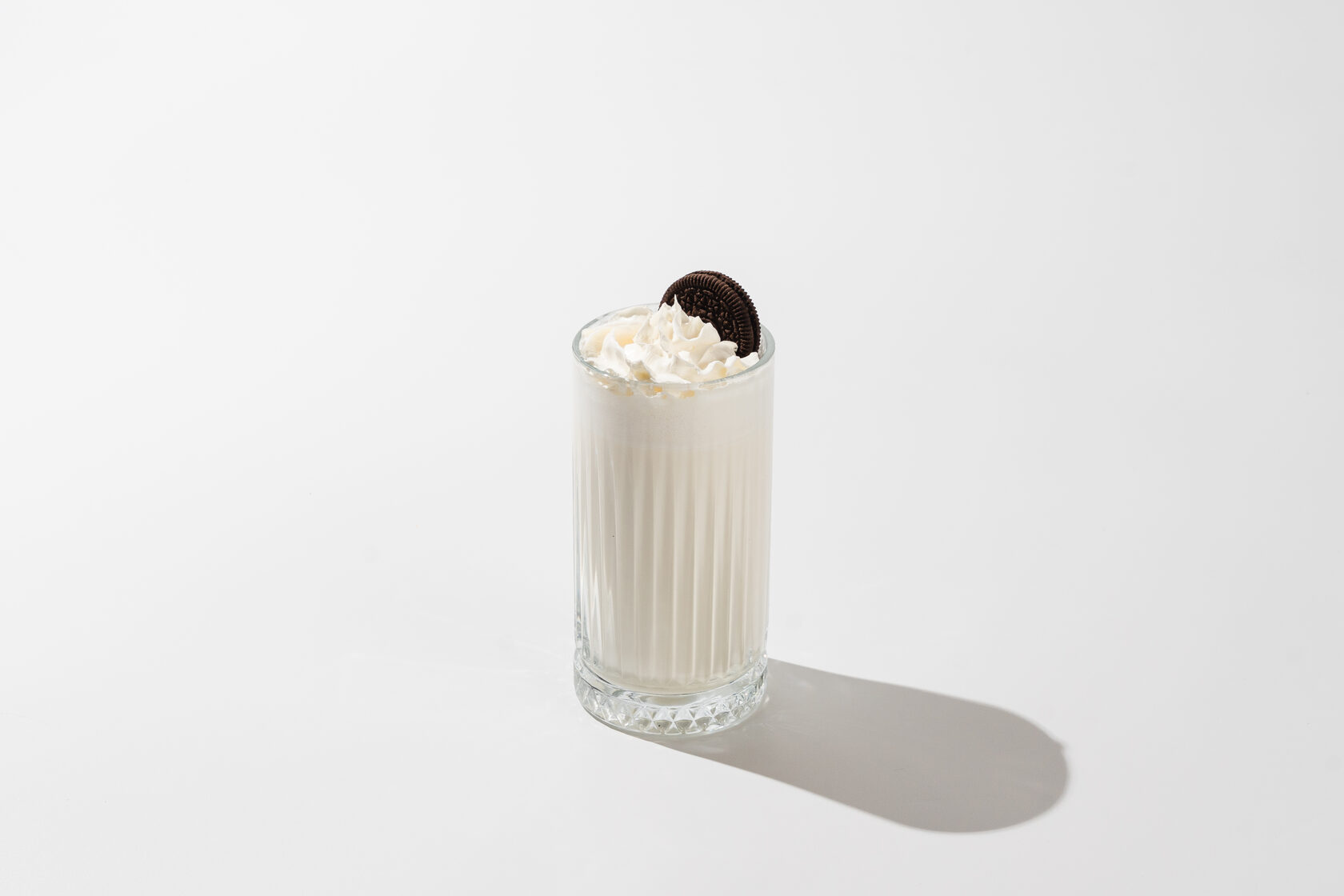 мороженое, молоко, сироп клубника, топпинг белый шоколад, взбитые сливки